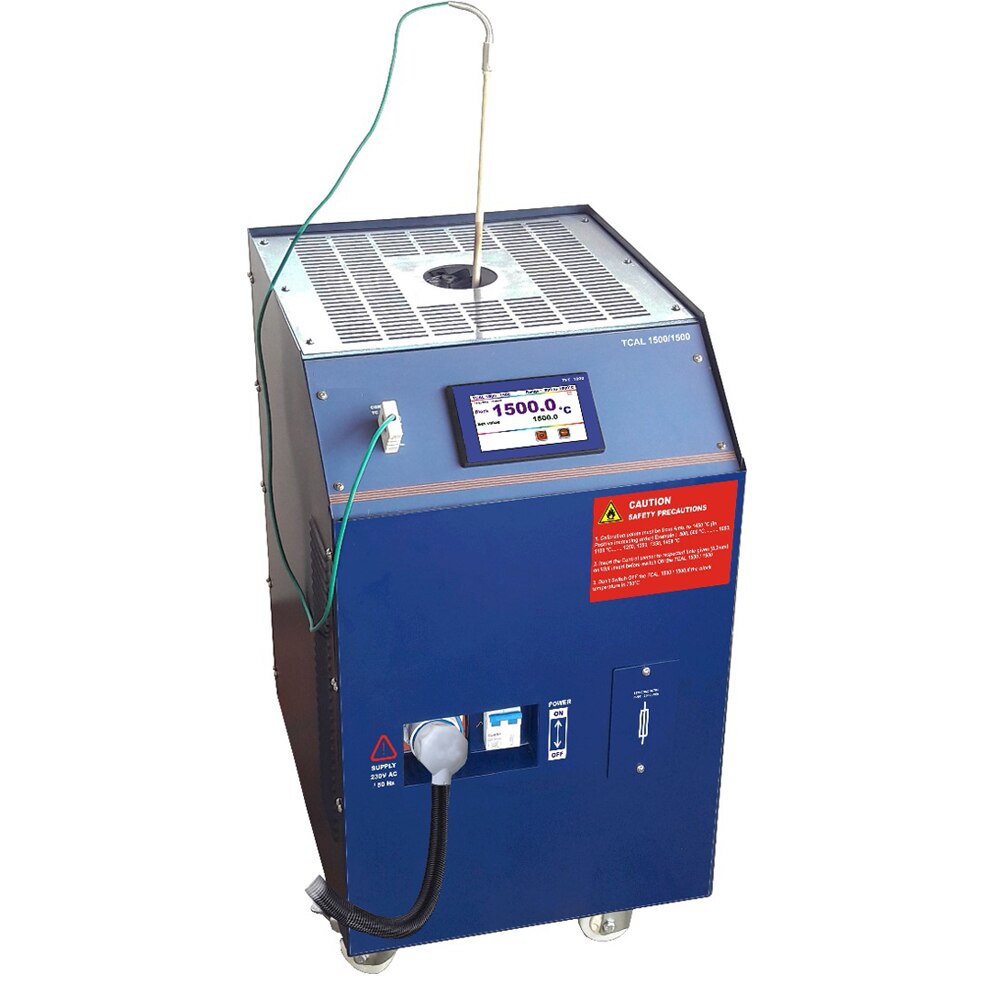 MODEL : TCAL 1500 / 1500 Temperature Range : 500 °C to 1500 °C Bath Temperature Control : Digital Temperature Controller with Auto Tune PID Algorithm Display : 4.3 inch True TFT display with touch screen Resolution : 0.1 °C Stability : ± 0.5 °C Accuracy : better than ± 0.5 % of reading Temperature Read Out : °C / °F Time to Stabilize : 30 (mins) Heating Time (to Max) : 60 Minutes to 3 ½ Hrs ( Amb. to 1500 °C) Well Dia : 70mm Well Depth : 215mm Inter changeable Thermo Well : 6,8,10,14,18,22, in mm (Approx) Switch Test : Provided PC Interface : RS 485 (optional) Power Supply : 230V AC or 110 V AC 50/60 Hz Power Consumption : 3500VA Dimension (W*D*H) : 520 L X 410 W X 625 H (mm) Instrument Weight (Approx) : 48 Kg (Approx.) with out well insertion