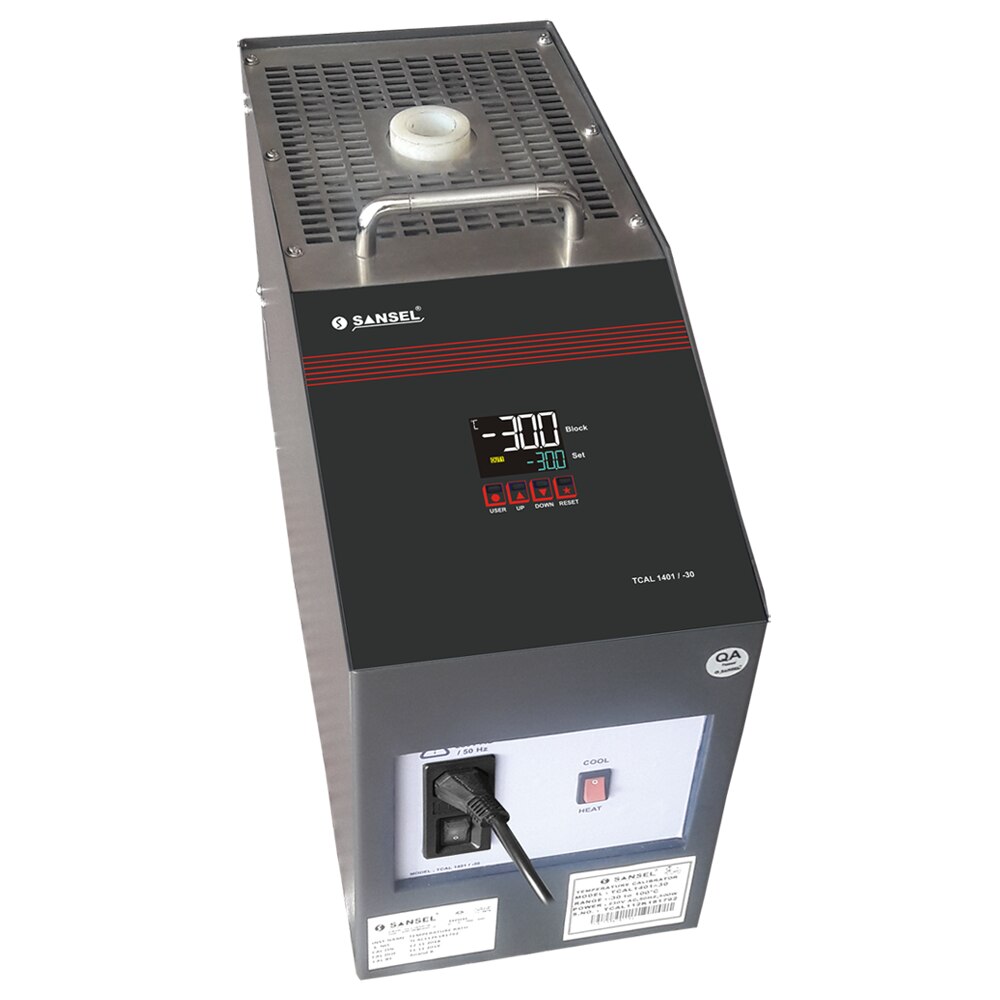 Model TCAL 1401 / -30 Temperature Range -30* to 100°C (* @ Ambient 25 °C) Resolution 0.1 °C Stability ± 0.1 °C Axial + Radial Uniformity Better than ± 0.3 °C Display 0.58” (15mm)(Block) / 0.3”(7.8mm) (Set) 4 digit LCD Display with 4 keys Accuracy Better than ± 0.3°C Temperature Read out °C Heating time 20 mins (Amb. To 100 °C) Cooling time 25 mins (25 to -30 °C) Stabilization time 10 minutes Well Dimension(dia. X height) 22x 120 mm Standard well holes in mm 5.2, 6.2, 6.2, Power supply 230V AC ± 10% / 50Hz (Optional 110V AC) Power Consumption 500 VA Overall Dimension in mm 490x 178x 357(L x B x H)(Approx.) Instrument Weight 12.5kg(without well insert)(Approx.)