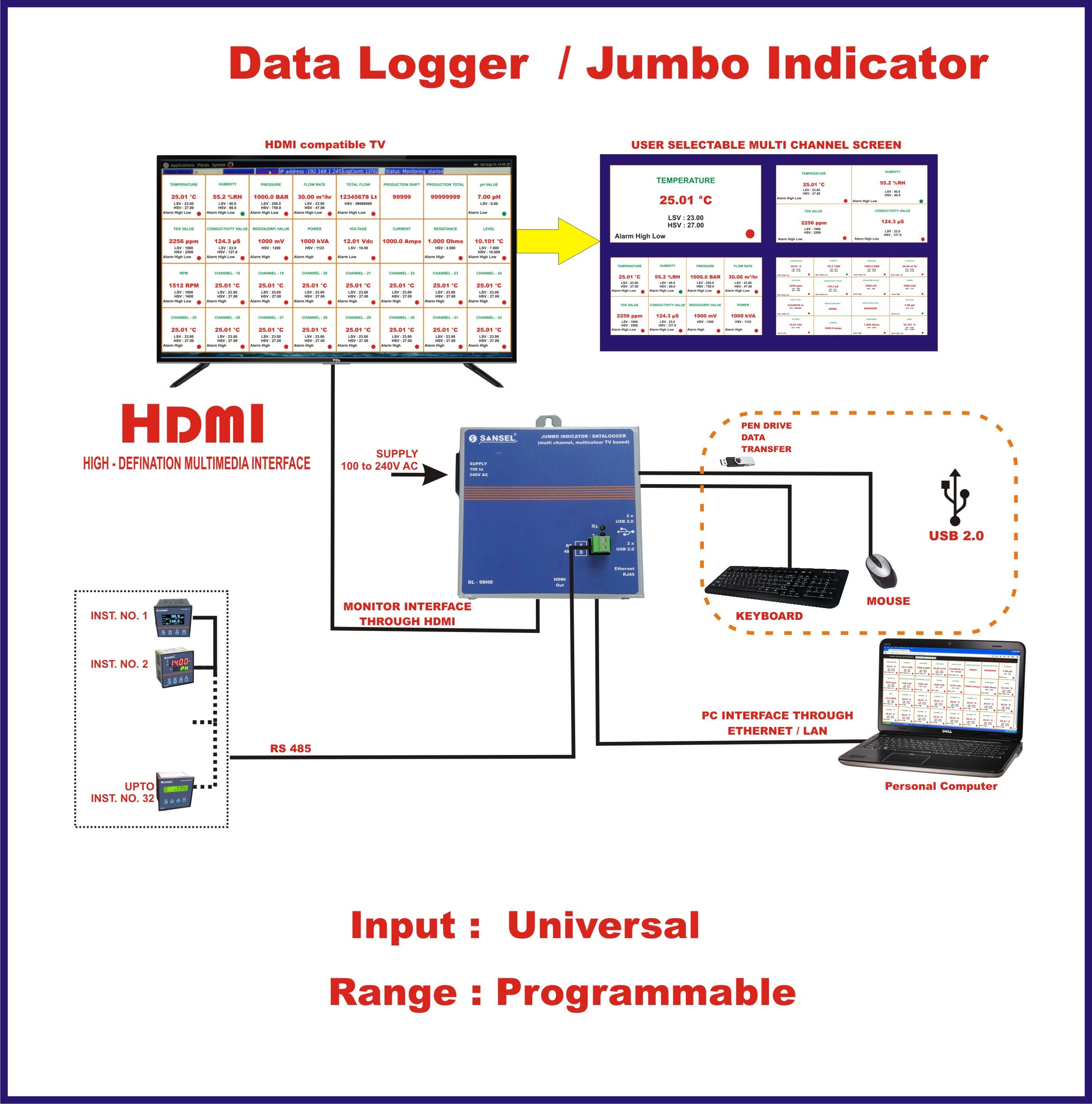 Model : DL 98HD Signal Input : RS 485(2 wire) Input Protocol : Modbus RTU Slave No. of. Channels : 32 FEATURES Ø It replace conventional 7 segment LED Ø Up to 32 input channels display Ø Custom selectable number of input Ø No size limitation- Depends upon customer channels scope(HDMI compatible TV) Ø User configurable RS485 MODBUS setting Ø Low cost Ø User selectable title and Engineering units Ø Universal indicator for any type of industrial Ø Alarm set point and status indication process parameter Ø Adjustable display font size Ø Input from RS485 MODBUS RTU protocol Ø Custom adjustable colour, background, Ø HDMI output for display connectivity display, title and units Ø OLED TV display or any type of HDMI input Ø Inbuilt Data logging facility display device Ø Optional Ethernet output for computer Ø Pen drive option for Data download DISPLAY PARAMETER Temperature * Humidity * pressure * Flow & Total flow * Volume * Level * Production counting * RPM * m/min * Co2 * Volts * Current Power * pH * TDS * Conductivity, etc,. Application » Pharma industries » Automobile industries » Power industries » Petrochemical industries Food industries