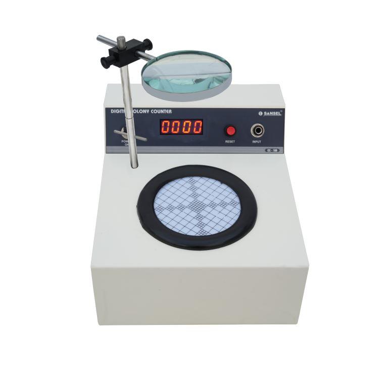 The most time-consuming part of carrying out a microbial count is the actual counting process on petri dishes. Colony counters facilitate this task and as a result are essential in every bacteriological laboratory. Their particular advantages are the easy, rapid and reliable counting of bacterial colonies with very simple handling. SANSEL colony counter Model CC 100 is easy to use and allows fatigue-free and safe work thanks to its problem-free counting mechanism: Marking the colonies on the petri dish with the marker pen activates the counter.