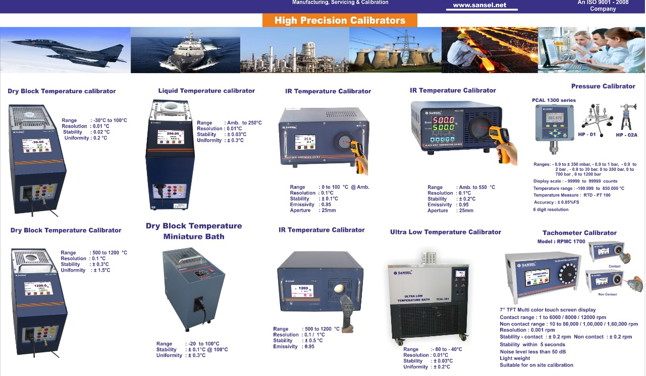 Calibration Equipment Manufacturer in India “SANSEL” series TCAL 1501 is a micro controller based precision “DRY BLOCK” temperature calibrators generates true reference temperature. The temperature controller of the calibrators uses a auto tune FUZZY PID controller algorithm. This response closely follows the heating / cooling curve of an actual thermal system. Place the sensor to be calibrated in the calibrator. Set the temperature from the 4.3 inch true TFT display with touch screen. Both Block, set and measure temperature can be read. When stabilization occurs, Simply read the temperature and re-calibrate the process system or sensor.