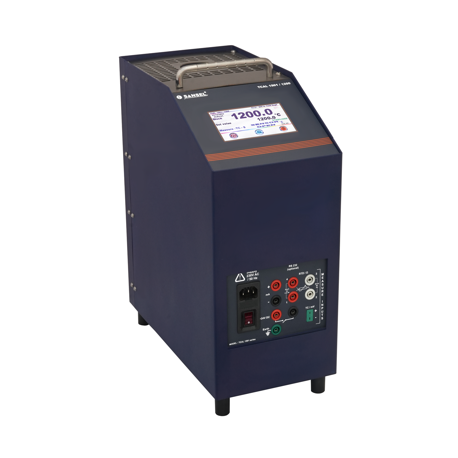 SANSEL Model TCAL 1501 series of Dry well Temperature calibrator range from - 30 to 1200°C in four model (TCAL 1501 / -30, TCAL 1501 / 300, TCAL 1501 / 600 & TCAL 1501 / 1200) are high precision, better resolution, stability, fast in heating and cooling. More well dia and depth to calibrate more number of temperature sensor at a time with better uniformity. These models can meet any calibration requirement in laboratories or in on site applications. This models are inbuilt measuring facility of the Thermocouples, RTD, Resistance, millivolt & milliamps to directly read the signals from most of the temperature sensors, indicator with sensor and Transmitter. Temperature range from 300 to 1200°C with high resolution 0.1°C up to 1200°C. This model is mainly used in all industries, like metal moulding, glass, ceramic & calibration laboratories etc., These models are using 4.3” True colour TFT display with Touch screen, easy to read multi parameter at the same time like, Block temperature, set temperature, measure value, Real time clock with date & time, Control Output %, Stability time & status, Range of the equipment with necessary unit of measurement and three soft touch keys are used for measure configuration, settings, calibration etc.., It has one more advantage of help menu for operating instruction of the equipment via the same screen , Hence no need of Hard copy of Instruction manual.