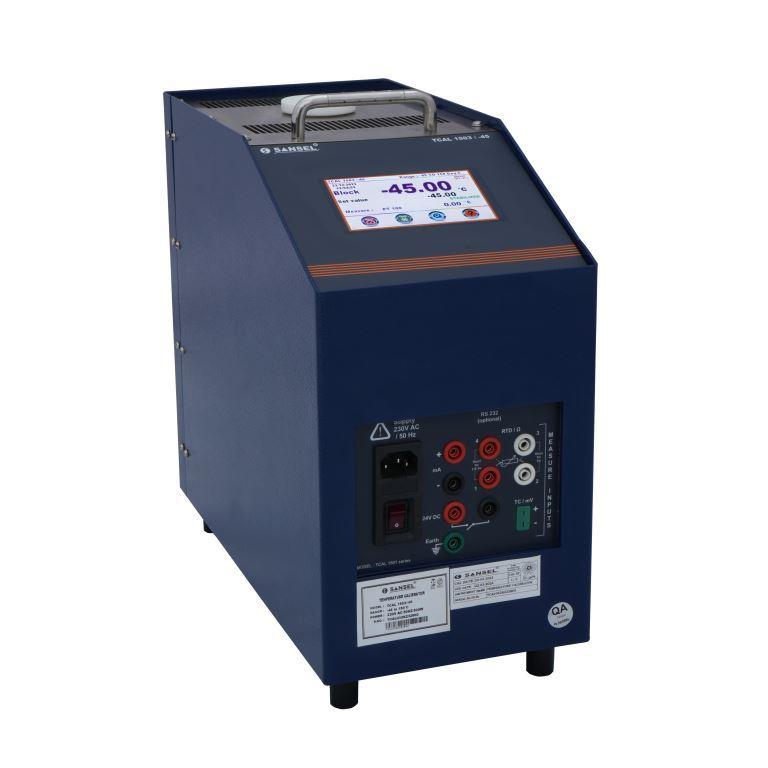 SANSEL Model TCAL 1503 series of Dry well Temperature calibrator range from -45 to 1200 °C in four model (TCAL 1503 / -45, TCAL 1503 / -35, TCAL 1503 / 300, TCAL 1503 / 600 & TCAL 1503 / 1200) are high precision, better resolution, stability, fast in heating and cooling. More well dia and depth to calibrate more number of temperature sensor at a time with better uniformity. These models can meet any calibration requirement in laboratories or in on site applications. This models are inbuilt measuring facility of the Thermocouples, RTD, Resistance, millivolt & milliamps to directly read the signals from most of the temperature sensors, indicator with sensor and Transmitter. Temperature range from -45 to 130 °C with high resolution 0.01 °C up to 130 °C.