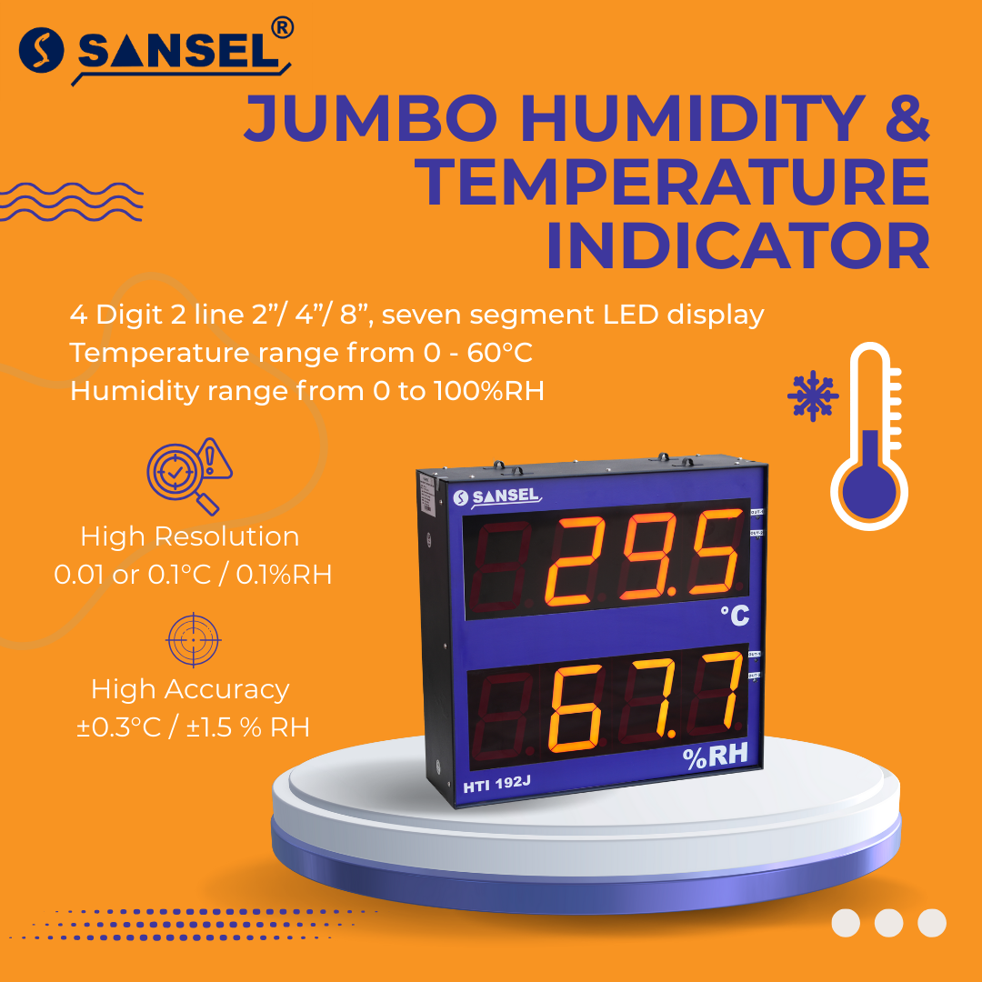 In the world of modern industrial and manufacturing environments, efficiency, productivity and safety are paramount. To achieve optimal performance, Operators and supervisors rely on advanced tools and technologies that provide real-time insights into the status of critical processes parameter to view from a long distance. One such tool is the Jumbo Humidity & Temperature Indicator, This series of big display indicators has a display height of 2’’,4’’,8’’ and 12’’sizes, which are visible distance from 50 feet, 100 feet, 200 feet and 400 feet. These Large size Jumbo Humidity & Temperature Indicator serves as a beacon of information, offering clear and immediate visibility into the ongoing wide range of process parameter applications such as Temperature, Humidity, Pressure, Flow, Level, pH, TDS, Conductivity, Production counting, RPM, Timing, Power, Voltage, Current, Frequency etc.,. these large displays play a pivotal role in keeping operations running smoothly. We offer customization options to tailor our Big Display Humidity & Temperature Indicator to your specific needs, applications are multiple indicators with different parameters in one panel.