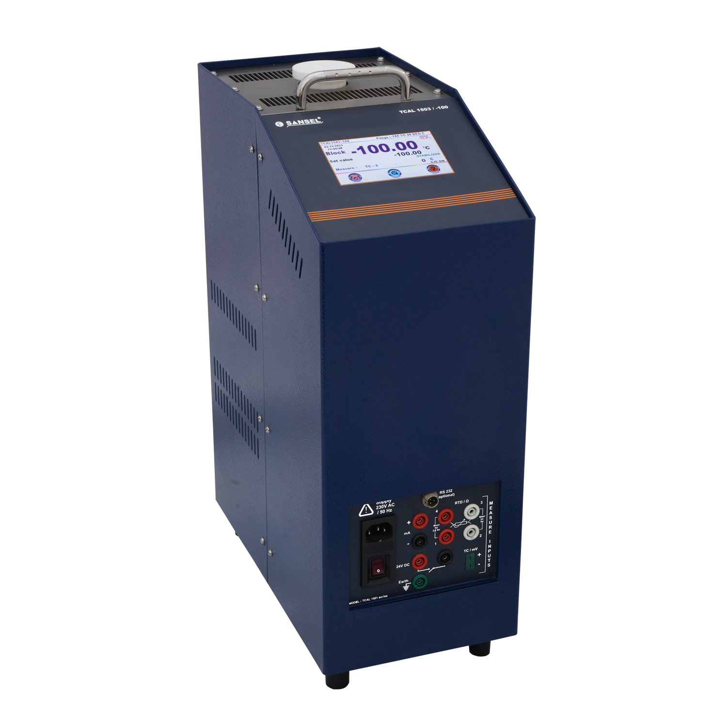 SANSEL Model TCAL 1503 series of Dry well Temperature calibrator range from -100 to 1200 °C in four model (TCAL 1503 / -100, TCAL 1503 / -45, TCAL 1503 / -100, TCAL 1503 / 300, TCAL 1503 / 600 & TCAL 1503 / 1200) are high precision, better resolution, stability, fast in heating and cooling. More well dia and depth to calibrate more number of temperature sensor at a time with better uniformity. These models can meet any calibration requirement in laboratories or in on site applications. This models are inbuilt measuring facility of the Thermocouples, RTD, Resistance, millivolt & milliamps to directly read the signals from most of the temperature sensors, indicator with sensor and Transmitter.