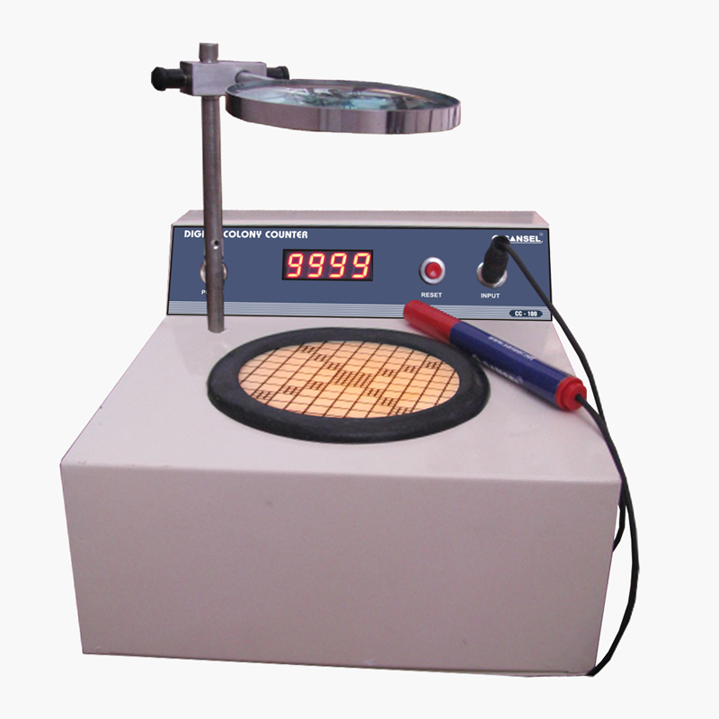 The most time-consuming part of carrying out a microbial count is the actual counting process on petri dishes. Colony counters facilitate this task and as a result are essential in every bacteriological laboratory. Their particular advantages are the easy, rapid and reliable counting of bacterial colonies with very simple handling. SANSEL colony counter Model CC 100 is easy to use and allows fatigue-free and safe work thanks to its problem-free counting mechanism: Marking the colonies on the petri dish with the marker pen activates the counter.