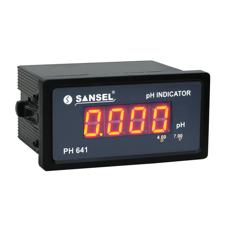 SANSEL make online pH indicator Model pH 641 is a precis, rugged and weather proof instrument carefully designed for the most accurate measurement of pH in all industries. These instruments are completely IC version using “MOSFET” input “OP -AMP” and CMOS ICs. This instrument is a panel mountable with a compact standard size of 48 x 96 x 65mm with front end potmeter type easy adjustable 4pH & 7pH buffer calibration option. This instrument operates from 90V to 270V AC / DC , 50Hz.