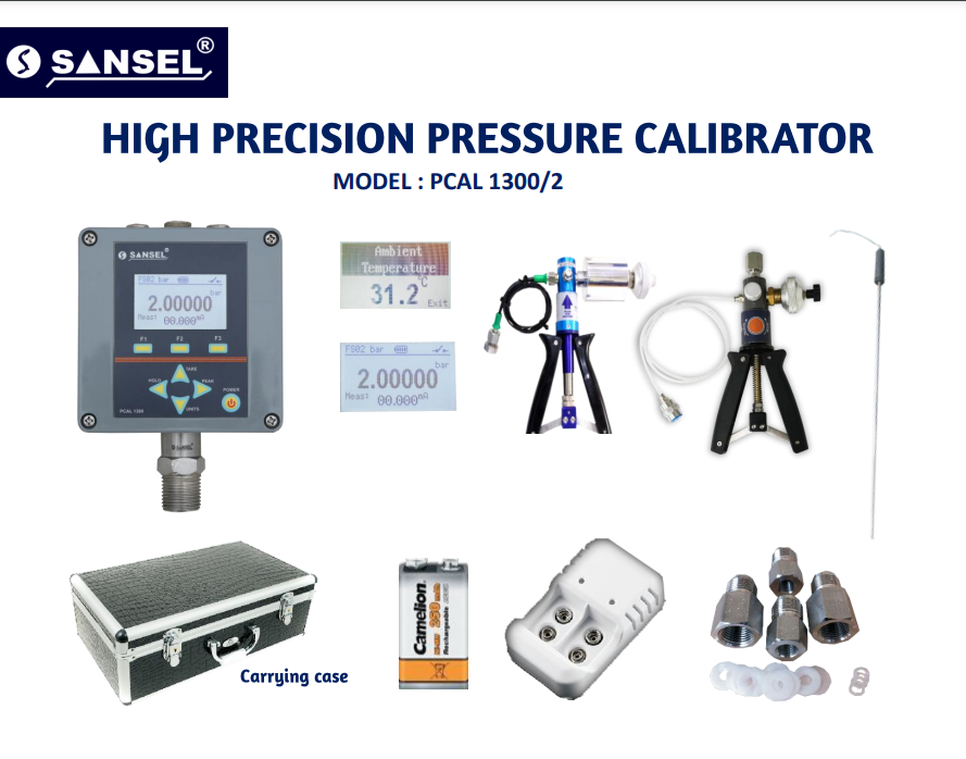 Exact Pressure Measurement and Monitoring are Must in Applications Crucial to Operational Safety of Machinery and Industrial Installations. Regular Inspection of the Pressure gauges / sensor / transmitters / indicators Used in these Applications is Absolutely Essential for Economic and Technical - Safety Reasons and is Already Prescribed as Obligatory in Many Sectors. “SANSEL” PCAL 1300 / 2 is a Micro controller based precision pressure calibrators generates true reference pressure. Connect the gauge to be calibrated in the calibrator. Set the pressure using respective pump when stabilization.