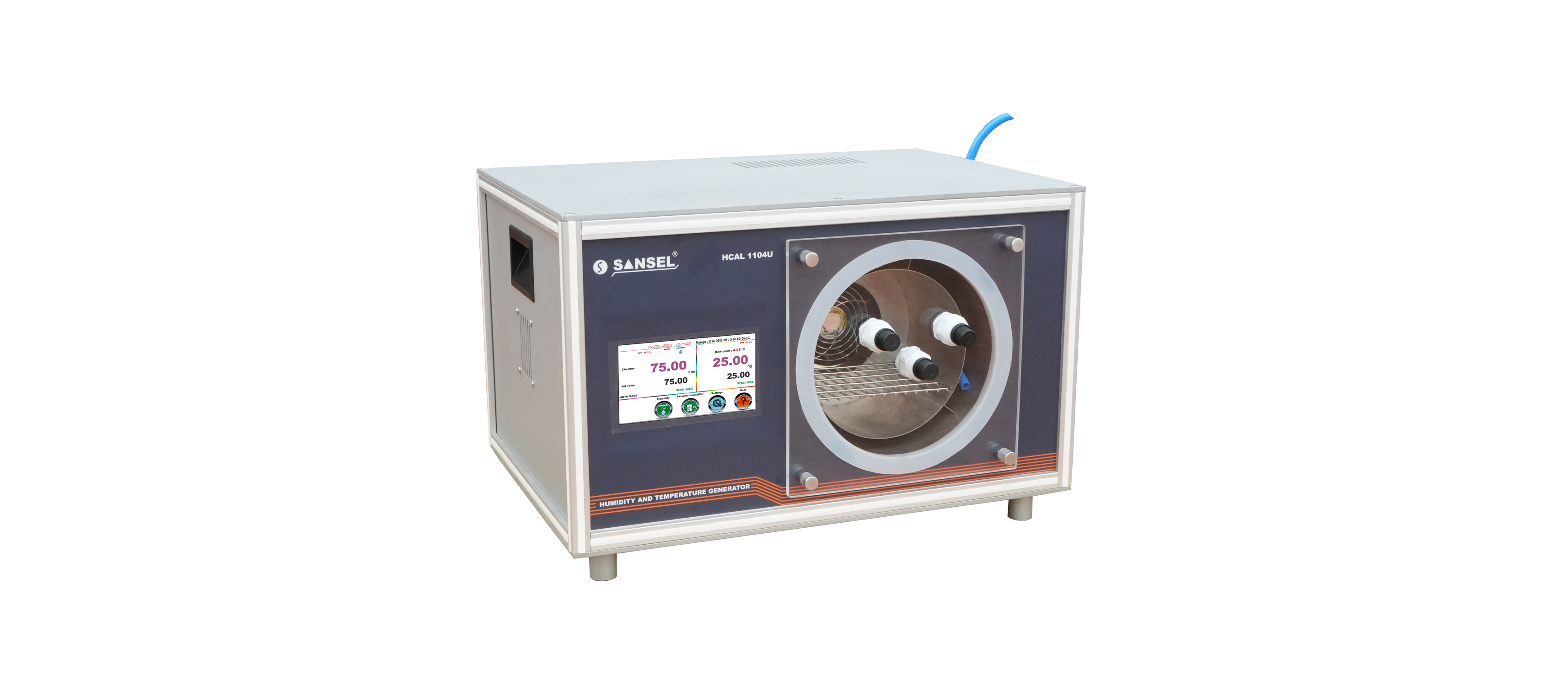 The HCAL 1104U working in the principle of mixed flow method for generating the Humidity. A desiccant cell is used to De-Humidify the chamber for low Humidity and Humidifier generates high Humidity. A solid state Peltier element is used for heating and cooling the chamber. The HCAL 1104U improved version has metrology level performance in terms of Control stability and uniformity gradients.