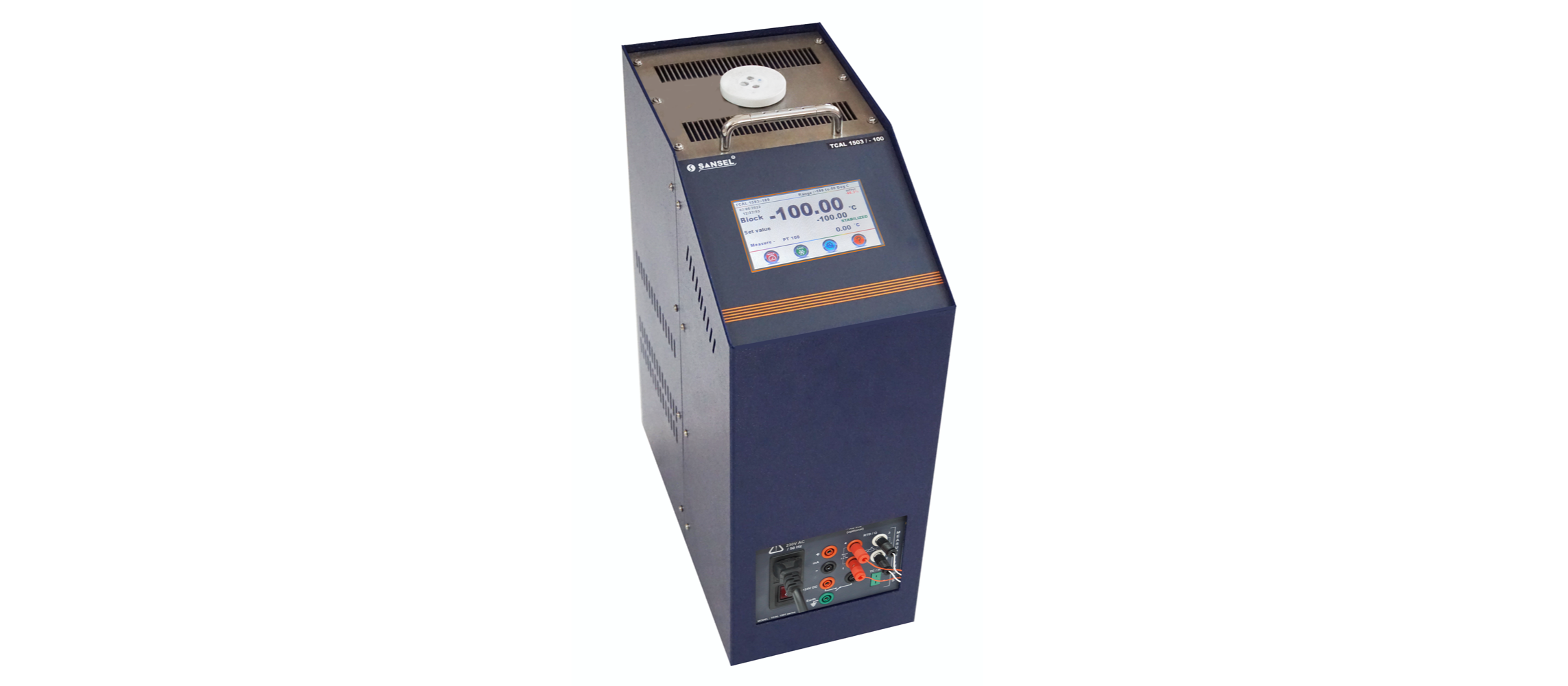 SANSEL High precision Dry Block temperature calibrator are better resolution, stability, fast in heating and cooling. More well dia and depth to calibrate more number of temperature sensor at a time with better uniformity. These models can meet any calibration requirement in laboratories or in on site applications. This models are inbuilt measuring facility of the Thermocouples, RTD, Resistance, millivolt & milliamps to directly read the signals from most of the temperature sensors, indicator with sensor and Transmitter. Temperature range from -100 to 40 °C with high resolution 0.01 °C up to 40 °C. This model is mainly used in all industries, like Pharmaceutical, food, Research & calibration laboratories etc.,