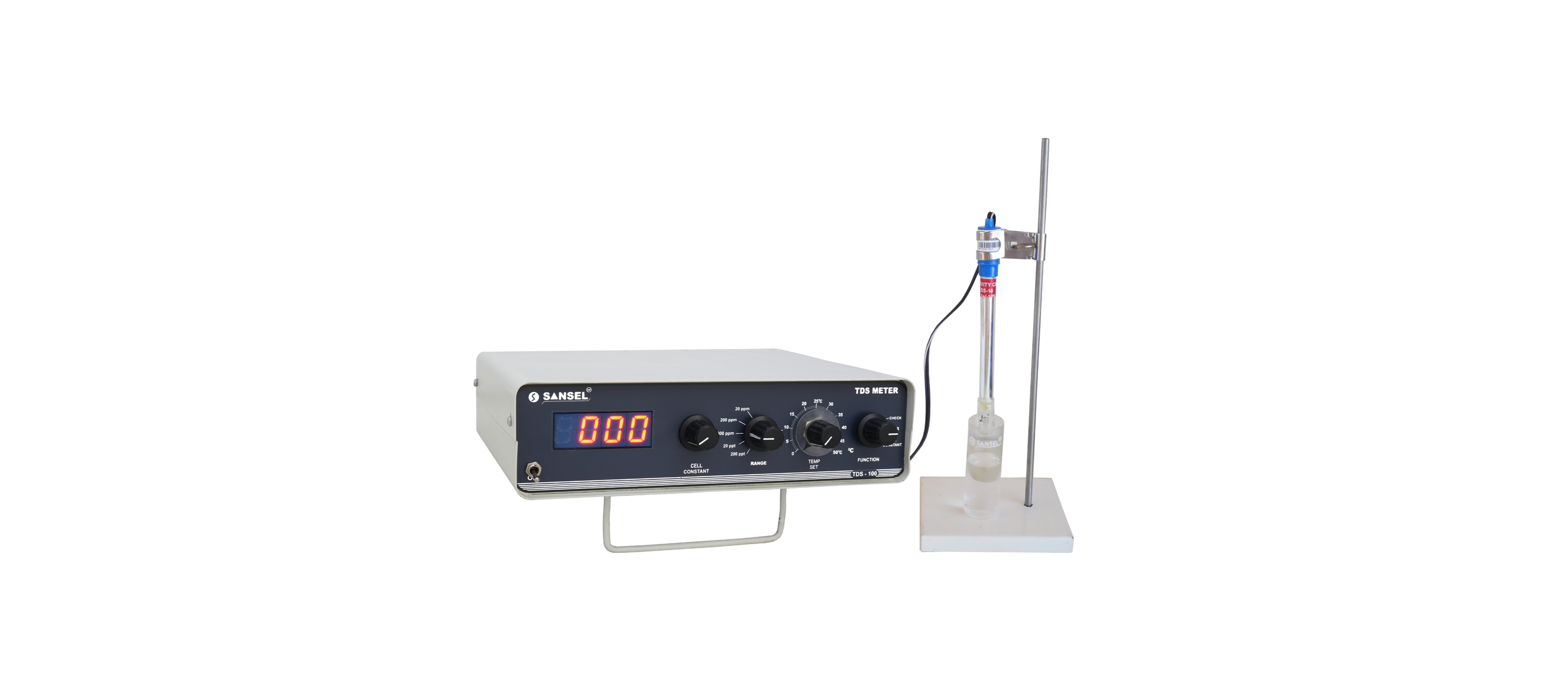 A large number of salts such as carbonates, bicarbonates, chloride, sulphates, phosphates & nitrates of calcium, magnesium, sodium, potassium, iron and manganese etc., are found dissolved in natural water. Similarly coastal marine water contains substantial quantity of these salts. A high content of dissolved solids elevates the density of water, influences Osmoregulation of fresh water organism and reduces solubility of gases thereby reducing the utility of water for drinking, irrigation and industrial purposes. Therefore, determination of Total Dissolved solids is one of the important parameters in water analysis. SANSEL make digital TDS meter TDS 100 is extremely useful for fast and accurate determination of Total Dissolved Solids in a liquid. The use of solid state technology and IC circuitry makes this instrument versatile and reliable. The multi position selector switch quickly sets the digital display to the desired test range. The instrument is ideal for testing of natural water, drinking water, waste water, brine solution, sea water and soluble salts, etc., .